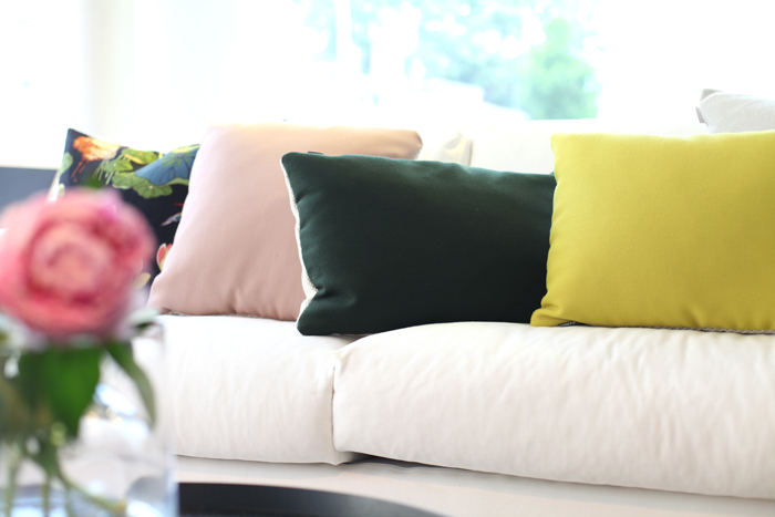 Toinen väri-ihastus löytyy Muuton tyynyjen muodossa. Erikoinen yhdistelmä persikkaan taittavaa roosaa, havun vihreää ja vihertävän keltaista, toimivat yhdessä mielettömän hyvin. Näiden vierellä pionin pinkki on ihanan karkkinen. Muutamalla ovelan värisellä tyynyllä harmoninen ja neutraali sisustus saa ihan uudenlaisen potkun. Jännittäviä värikomboja on myös Hayn uusissa pyyhkeissä, niissä on sekoiteltu keltaista, vihreitä, roosaa ja harmaata valkoiselle pohjalle. Pastellia kerrassaan. Uskaltakaa kokeilla värejä - energiaa!