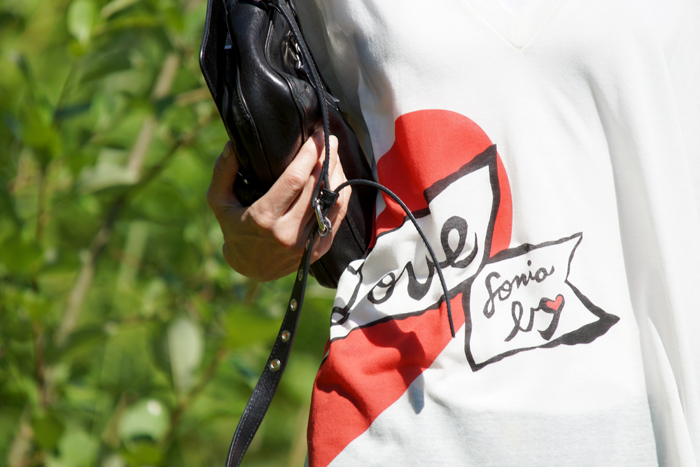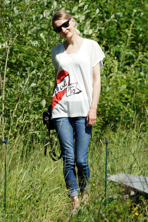 (t-paita Sonia by Sonia Rykiel / farkut Current Elliott Stiletto / laukku 3.1 Phillip Lim / aurinkolasit Ray Ban)