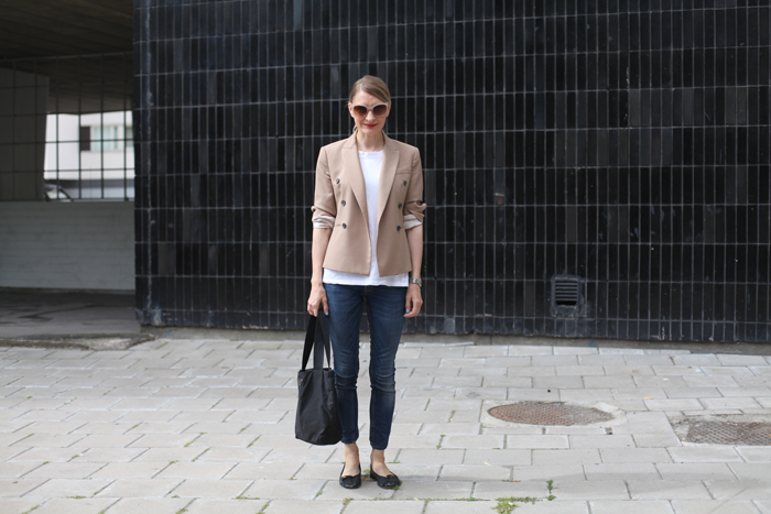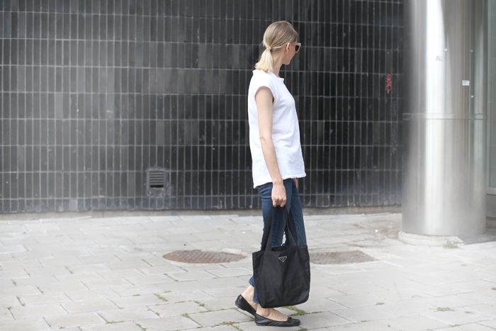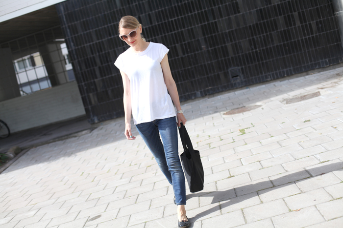 Päivän asuteemana on simppeli. Ihan yksinkertaiset asiat ovat oman vaatevarastoni perusta, hyviä valkoisia t-paitoja ja istuvia farkkuja ei voi koskaan olla liikaa. Kengistä lemppareimmat ovat ballerinat, Repetot ovat aina hyvä valinta. Laukuksi nappasin tänään mukaani ikivanhan Pradan kassin, miten olenkin unohtanut sen kaapin perälle. Kepeään laukkuun mahtuu hyvin myös järkkäri, aika kätevää näin bloggarin näkökulmasta.
