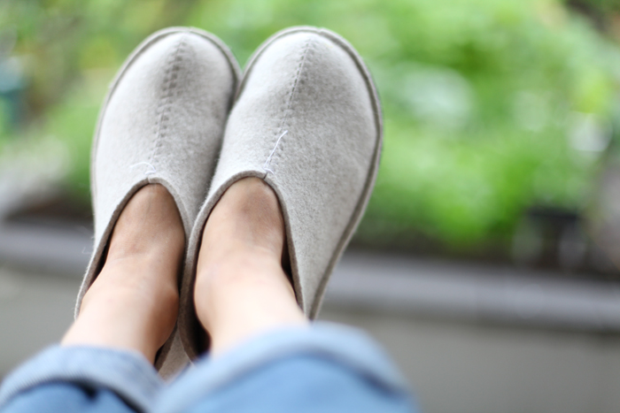 Mikäs on sateella ollessa katetulla terassilla. Jalat voi nostaa ylös ja nautiskella. Lämmittäjinä Pia Wallenin mahtavat huopatossut, nämä ovat niin hyvät, että kotiutin toiset samanlaiset mustina. Ja kun laskee katseen alas tuolilta, näkee tuollaisen suloisuuden.