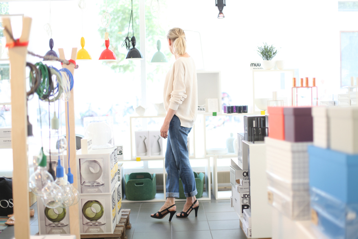 (paitapusero Ralph Lauren / farkut Nudie / ballerinat Chanel / taulu Juhani Melender / valaisin Tom Dixon / muki Design Letters)