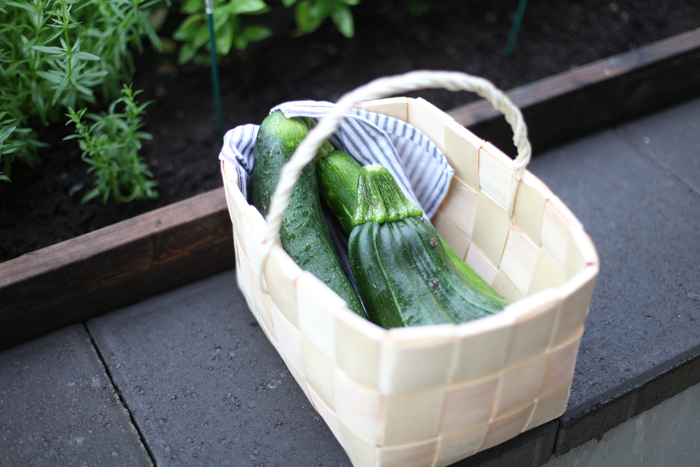 Illan päätteeksi kierros kasvimaalla, saaliina kesäkurpitsaa, sitä on tosi runsaasti tulossa - Maija alahan katsella kesäkurpitsareseptejä, huomenna saat pötkylän. Ostin torilta tuollaisen pärekorin, siihen keräillään kasvimaalta aterian raaka-aineet. Niin söpöä.