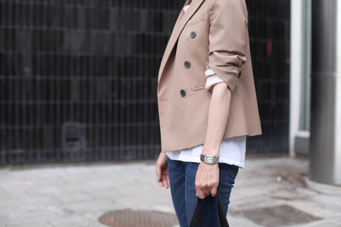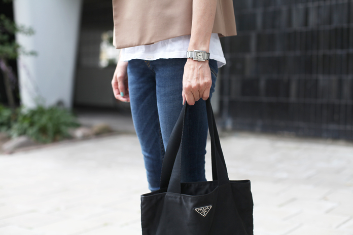 (jakku Zara / t-paita ja farkut Acne / laukku Prada / ballerinat Repetto / kello Cartier / aurinkolasit Seppälä)