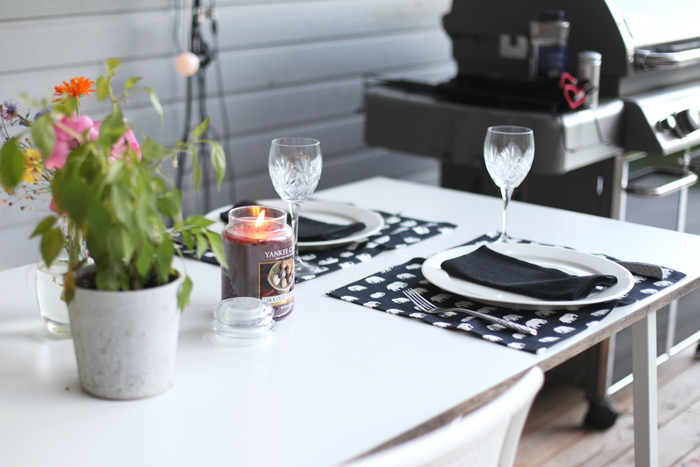Lauantai oli erityisen ihana päivä. Työpäiväni jälkeen istuskeltiin pihalla auringossa ja katseltiin kun koirulaiset leikkivät. Sitten käytiin saunassa, vilvoiteltiin, sytyteltiin lähestyvää hämärää ajatellen kynttilöitä pitkin pihaa ja terassia. Valmistettiin iltaruokaa, jälleen kerran kesäkurpitsasta. Pöytä katettiin rennosti kaapista löytyneillä pellavilla ja valkoisilla lautasilla, viiniä varten valittiin kristallilasit.