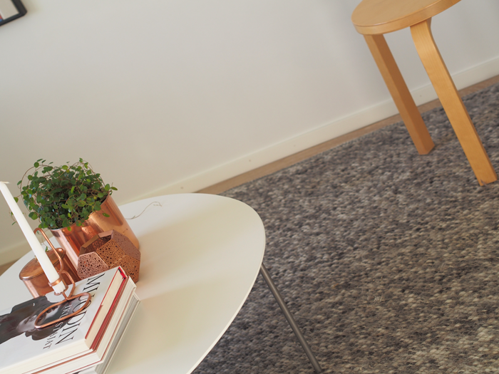 Pidän myös siitä miten harmaa villamatto sopii metalliin. Lämpimänä luonnollisena elementtinä se tuo kodikkuutta valkoisuuteen ja selkeyteen. Matto on Linie Designin Sirius värissä grey. Olen ollut mattoon todella tyytyväinen nyt vuoden käytön jälkeen. Se on kestänyt hyvin kahden koirulaisen leikit ja menot.