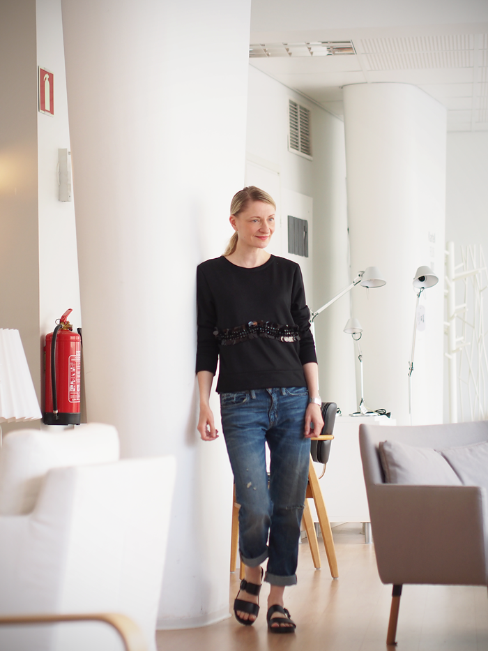 Yksinkertainen työasu tänäänkin. Jännää asuun tuovat paljetit ja tietysti nuo rumankauniit sandaalit. Kenkävalinnoilla voi vaikuttaa tosi paljon asun ajankohtaisuuteen ja tyyliin. Jos olisinkin kulkenut koko päivän aamulla jalkaan sujauttamissani Lanvinin ballerinoissa, olisin ollut hitusen naisellisempi.