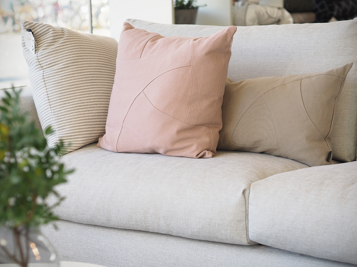 Ensimmäisenä etsin kodistamme hempeän tehostevärin, eli roosan. Olohuoneemme on tällä hetkellä harmaavoittoinen ja olen pitänyt väriskaalan puuterisen harmonisena. Niinpä myös roosan sävyt ovat hienovaraisia. Roosaa löytyy pieninä pisteinä Hayn nappityynystä ja haaleampana Linumin pellavatyynystä. Tyynyjen tuomaa vaaleanpunaista korostin hempeän sävyisillä neilikoilla. Tehostevärin ei tarvitse pompata huoneen sisustuksesta, vaan se voi olla vain mieto häivähdys jotakin väriä. Monesti soljuvan pehmeä väriskaala on miellyttävämpi kuin kovia kontrasteja sisältävä.