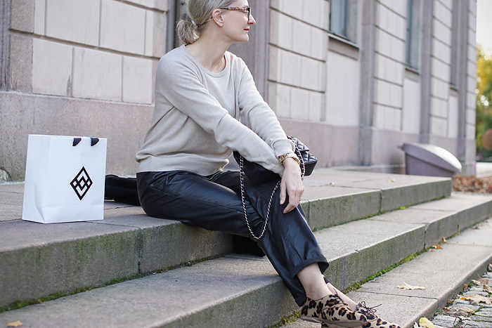 Tässä asussa nahkahousut antavat kontrastia lämpimälle villalle. Asusteilla simppelistä kokonaisuudesta tulee näyttävä.