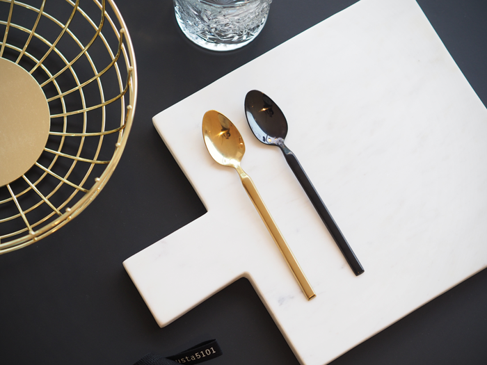 Olen jo pitkään halunnut itselleni kullanvärisiä pikkulusikoita, ne toisivat vähän jännitystä kattauksiin ja tietysti tätä hetkeä myös. Vaikka kulta onkin klassikko, näkyy sitä nyt erityisen paljon. Kuvissa on Menun ihana leipä/hedelmäkori, musta 5101-pellavapyyhe, Hobstar-lasit ja Tom Dixonin tuikkukupit.