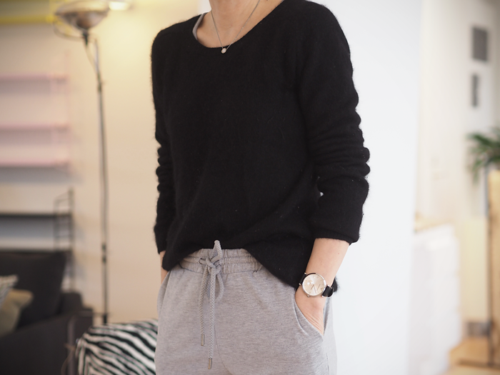 Olen vähän pyöritellyt kangasmalleja töissä, siitä on muistona puserossa nukkaa. Ikinä ei muista, ettei kankaiden kanssa työskentelevälle paras työasu ole pörröinen musta neule.