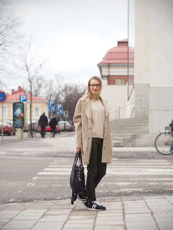 (takki Tiger of Sweden / neule Arela*saatu / housut Zara / lenkkarit Karhu / laukku Lumi*saatu)