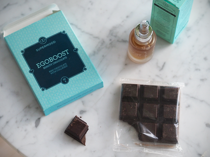 Saimme tilaisuudessa lahjaksi Supermoodin terveyssuklaata, jota voi tosiaan napsia hyvällä omallatunnolla. Suklaassa on mukana kollageenia ja pakurikääpää (antioksidantti). Tällainen suklaalevy on muuten mainio pikkulahja vaikka ystävättärelle.