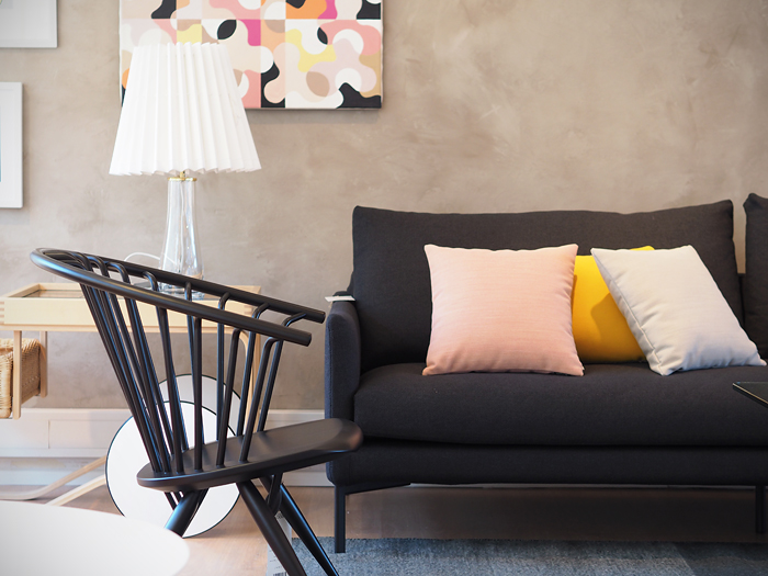 Asuimme 50-luvun kerrostalon viidennessä kerroksessa. Ikkunoita ja tilaa oli todella paljon. Minusta tilaa oli liikaakin, olkkaria oli tosi vaikea saada kauniiksi ja kutsuvaksi. Meillä oli siellä kaksi erilaista istuinryhmää. Toisessa oli kodikkaampi tunnelma ja toisessa katseltiin telkkaria, ja tietysti istuttiin kannettavat tietokoneet sylissä.
