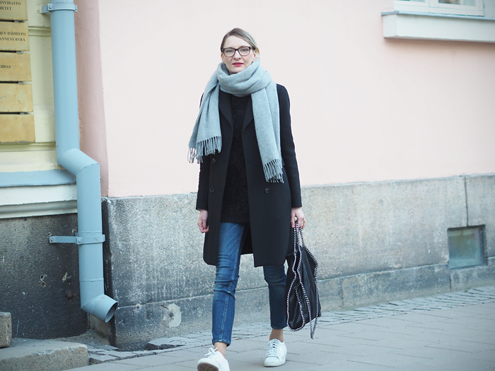 Kietouduin oikein mielelläni tänään tuohon lämpimään villakangastakkiin. Kaulaa lämmitti yksi kolmesta jättihuivistani, Gaudetesta saatu Acnen kuviollinen Canada-huivi. Jalassa taas valkoiset tossut. Miettikäähän muuten miltä asu näyttäisi jos niiden tilalla olisi vaikkapa mustat nilkkurit.