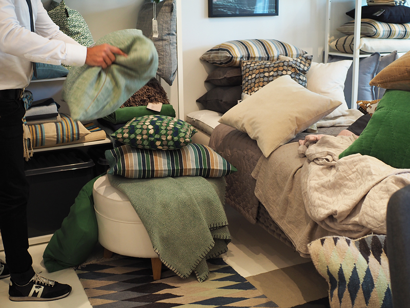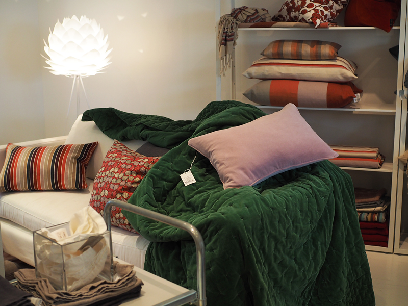 Pistettiin koko showroom ihan sotkuun kun riivittiin hyllyiltä tyynyt ja peitot kasoiksi ja hypisteltäviksi. Tilasimme päiväpeittoja; samettisia, puuvillaisia ja pellavaisia. Lisäksi mielettömiä tyynyjä samoista materiaaleista. Väriskaala on vihreää, roosaa, luonnonvalkoista, harmaata, nougattia ja hiekkaa. Vaikka joukossa on paljon värejä, on tunnelma silti hillitty, koska sävyt ovat hienosti mietittyjä.