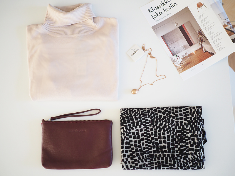 (poolo Tiger of Sweden / laukku ja huivi Marimekko / kaulakoru Edblad)