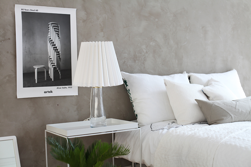 Roosan päiväpeiton ympärille tehty kokonaisuus on kivan rento. Tykkään erityisesti valaisinvalinnoista ja lehtipinosta, heh.