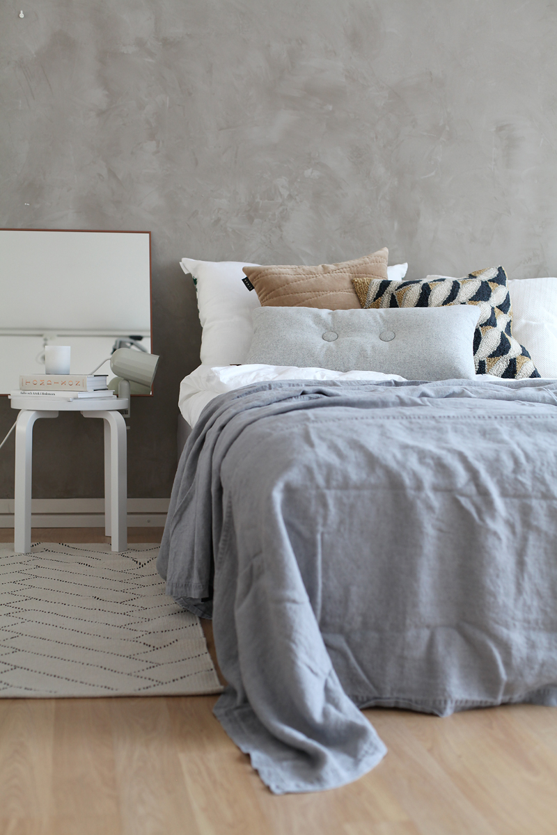 Tuo ensimmäinen kuvatulva oli harmaasävyisestä stailauksesta. Siinä on rento ja huoleton meininki. Sävymaailma on pehmoinen ja harmoninen, tehostesävynä kamelinbeige, joka lämmittää harmaata väriskaalaa. Huomatkaa myös miten byLassenin kuparikehyksinen peili luo makuuhuoneeseen ekstratunnelmaa ja valoisuutta. Peiliä voi käyttää sisustuksessa myös talun sijaan seinäelementtinä.
