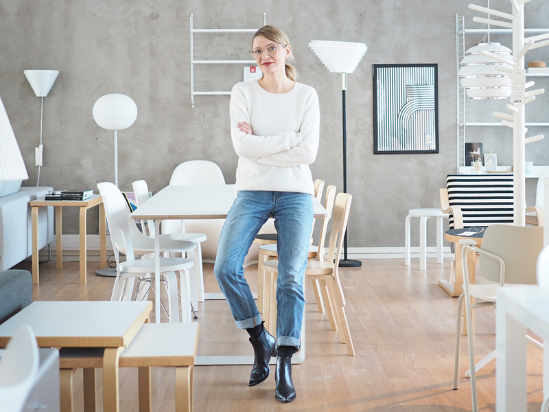 Annoin Maijalle kuvausohjeita kun hän seisoi työpaikan oven suussa ja napsi kuvat. Sanoin ettei kenkien tarvitse näkyä. Aika sekalainen setti koko asu tällaisena kerrostuksena, mutta olipa lämmin. Sisällä kokonaisuus näytti vähän selkeämmältä, ja jalkaan sujautin Tigerin lempiloaferini. Tykkään niin paljon perusasukombosta - kasmirneule, farkut ja loaferit.
