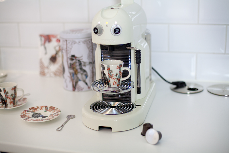 Olen joskus aikanaan saanut Nespressolta Maestria-kahvikoneen ja täytyy sanoa että meillä se on kyllä todella kovassa käytössä. Isäntä juo joka aamu tuplalungon, minä puolestani pidän aamuisin enemmän tavallisesta suodatinkahvista, joten keitän omat aamukahvini tällä koneella. Päivällisen jälkeen juomme molemmat iltakahviksi espresson tai lungon, joten silloin tämä Maestria on taas käytössä. Meillä on siis keittiössä kaksi erilaista kahvipistettä, näissä kuvissa on Nespresso-piste.