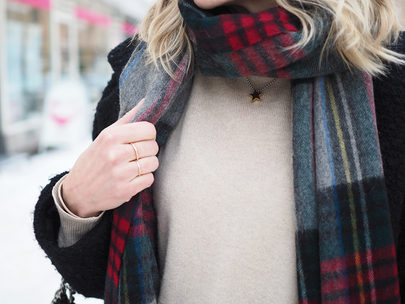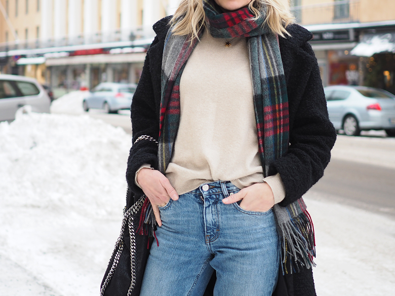 Tässäkin muuten huomaa miten asusteet vaikuttavat asuun. Jos kaulassa olisi ollut yksivärinen huivi ja käsivarrella yksinkertaisempi kassi, ei kokonaisuus olisi näin levoton. Ruutuhuivia halusin välillä ulkoiluttaa ja Stellan kassi on haasteellisten sääolosuhteiden vakkari.