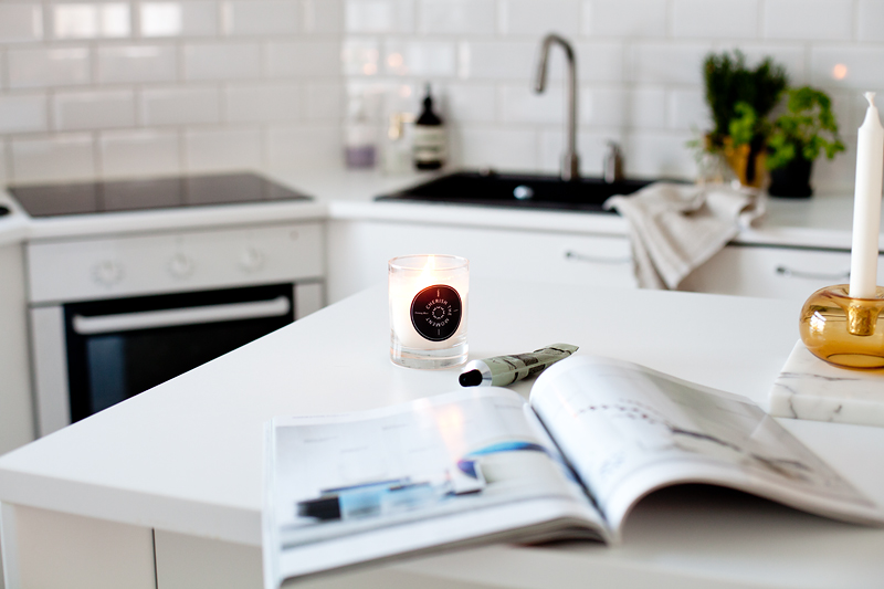 Keittiöön lisätty saareke oli tietysti myös eräs parhaimmista päätöksistä. Sen ääressä tulee oleskeltua todella paljon. Siinä syödään, seurustellaan vieraiden kanssa, luetaan lehtiä, setvitään posteja (valitettavasti niitä siinä yleensä ajelehtii). Lisäksi keskisaarekkeelle on kiva koota ajankohtaisia nättejä juttuja, kuten tuoksukynttilöitä, käsivoidetta, pieniä kukkakimppuja jne. Viihdyn parhaiten tunnelmallisessa ympäristössä, jossa on jotain pientä ja nättiä somistetta. Eli meidän tasot eivät ole tyhjiä.