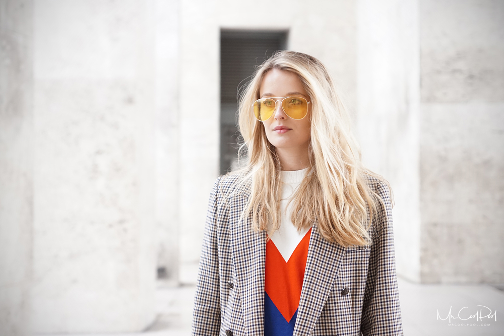 Ihastuin tässä asukokonaisuudessa klassisen ja rohkeamman yhdistelmään. Ajatonta edustavat upea ruudullinen pikkutakki, tummansiniset farkut ja Guccin loaferit. Värikäs pusero kuitenkin rikkoo ovelasti tyyliä, kokonaisuus ei näytä tylsän perinteiseltä vaan modernin raikkaalta. Pieni jippo on myös verkkosukkikset, kikka jota olen itsekin välillä käyttänyt asuissa tehosteena. Vielä lisämausteena huikeat keltasävyiset pilottilasit. Kuulin muuten Petriltä, että Pariisissa oli tosi paljon pilottimallisia laseja, niin silmälaseina kuin aurinkolaseinakin.