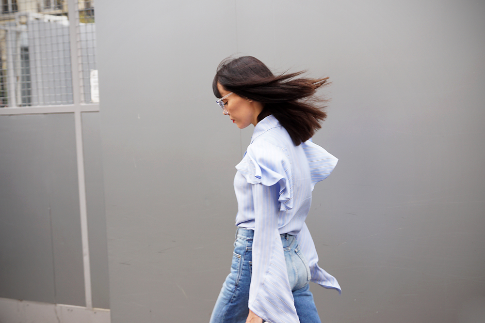 Tässä asukokonaisuudessa tiivistyy aika hyvin tämän kevään trendit. Paitapusero, jota koristaa röyhelöt. Rennot korkeavyötäröiset farkut, tasaisen sinisen sävyisenä. Pistkokasmalliset kengät ja ruskea nahkalaukku. Ihastelen kokonaisuudessa myös vaaleansinisen paidan ja kirkkaanpunaisen huulipunan yhdistelmää.
