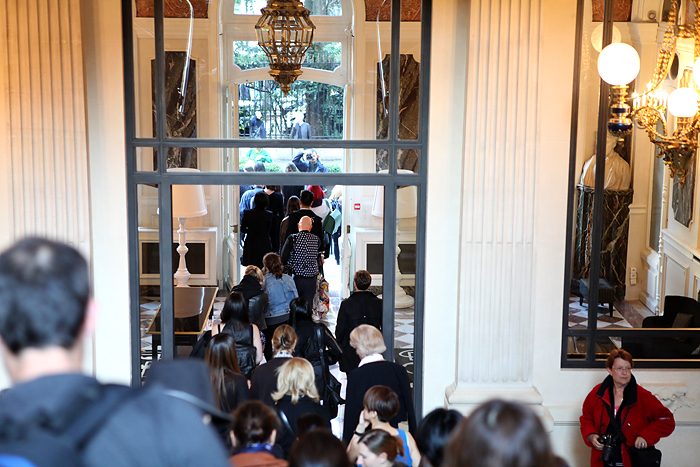 Tyylikkäät vieraat saapuivat näytökseen, poseerasivat kuvaajille ja rentoutuivat hetken seurustellen ennen sisään astumista. Rakennuksen upea portaikko ja kultaa notkuvat koristelut saivat kyllä polvet tutisemaan jo näytössaliin astellessa. Oli aika uskomaton fiilis mennä täpötäyteen, spottien loisteessa hohtavaan tilaan, odottelemaan mallien esiinmarssia. Vaikka itse vaatteet eivät omaan elämään kolahtaneetkaan, oli tunnelma upea.